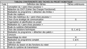 Quelles sont donc les tâches à prévoir pour réaliser le projet robotique ? Dans quel ordre faut-il effectuer ces tâches ?